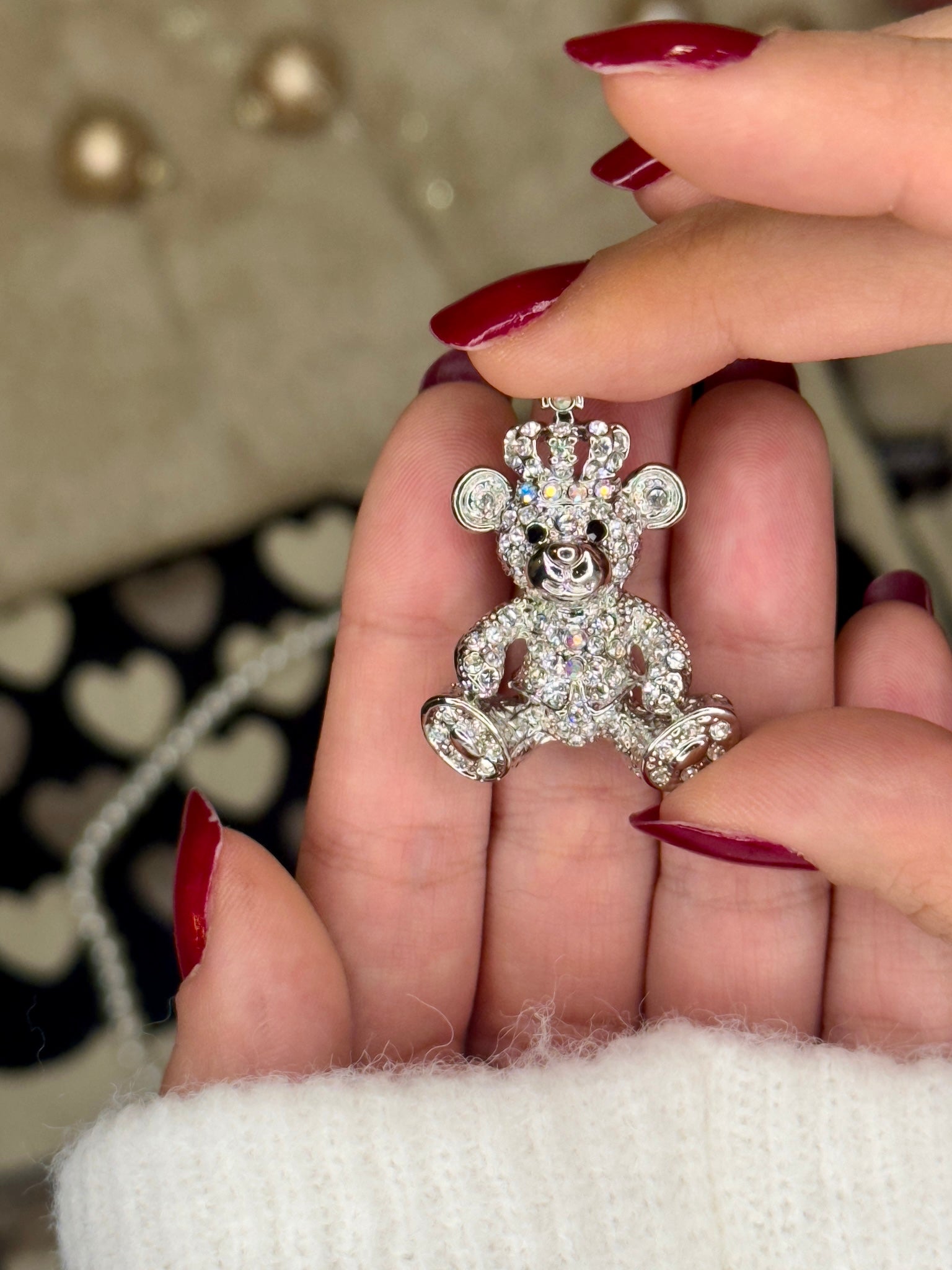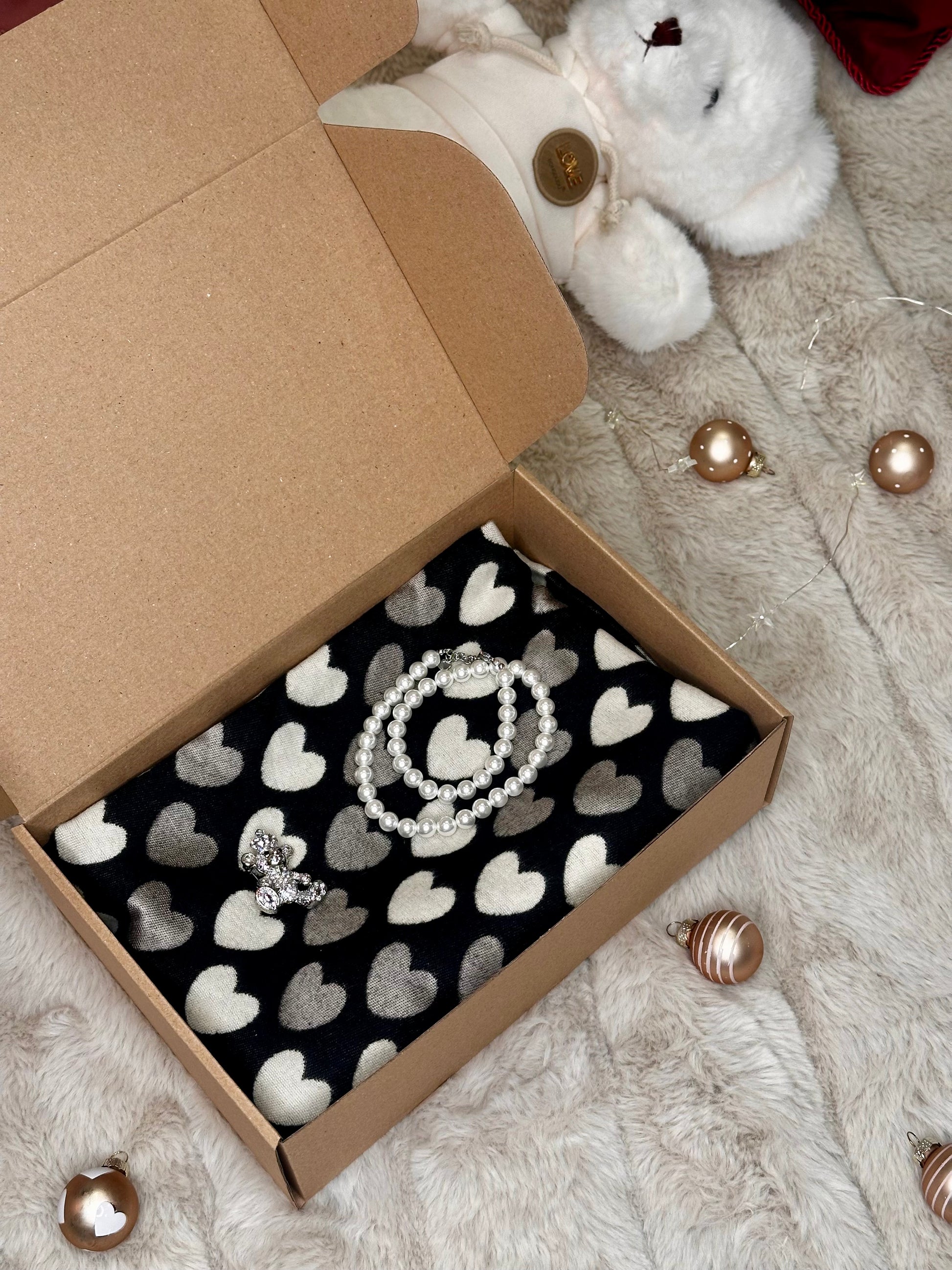 V setu prejmete mehki šal, broško z medvedkom in ogrlico iz perlic